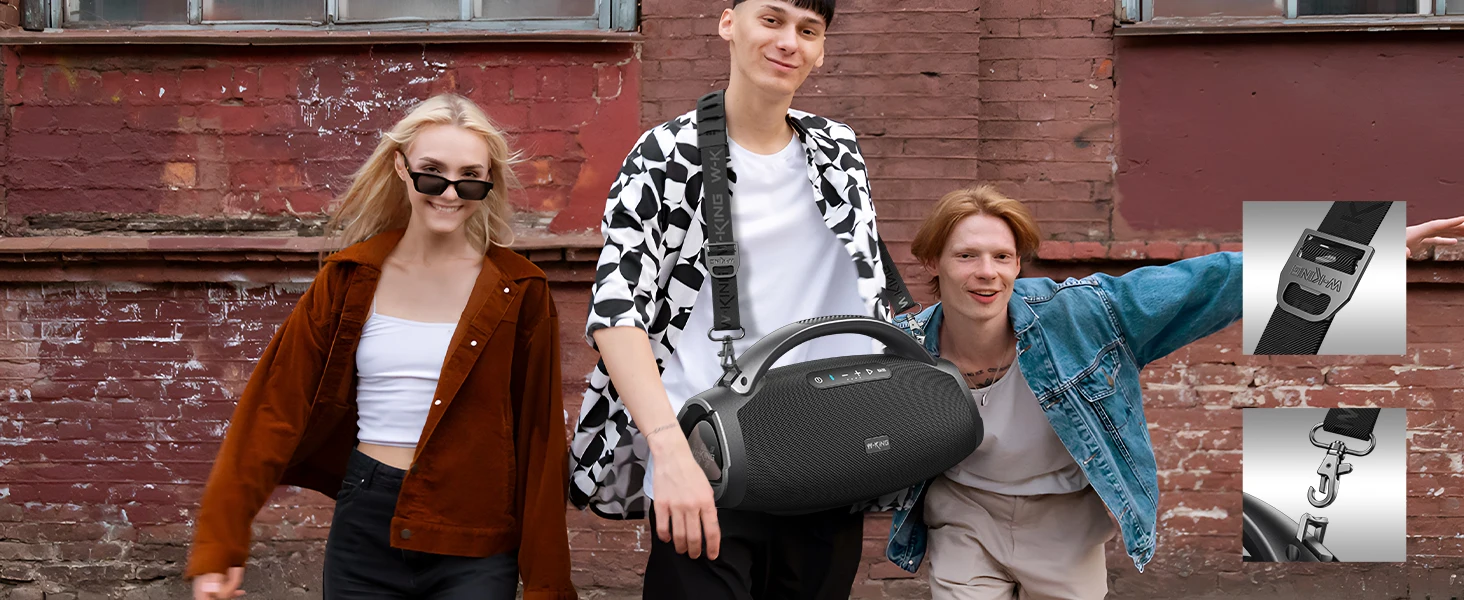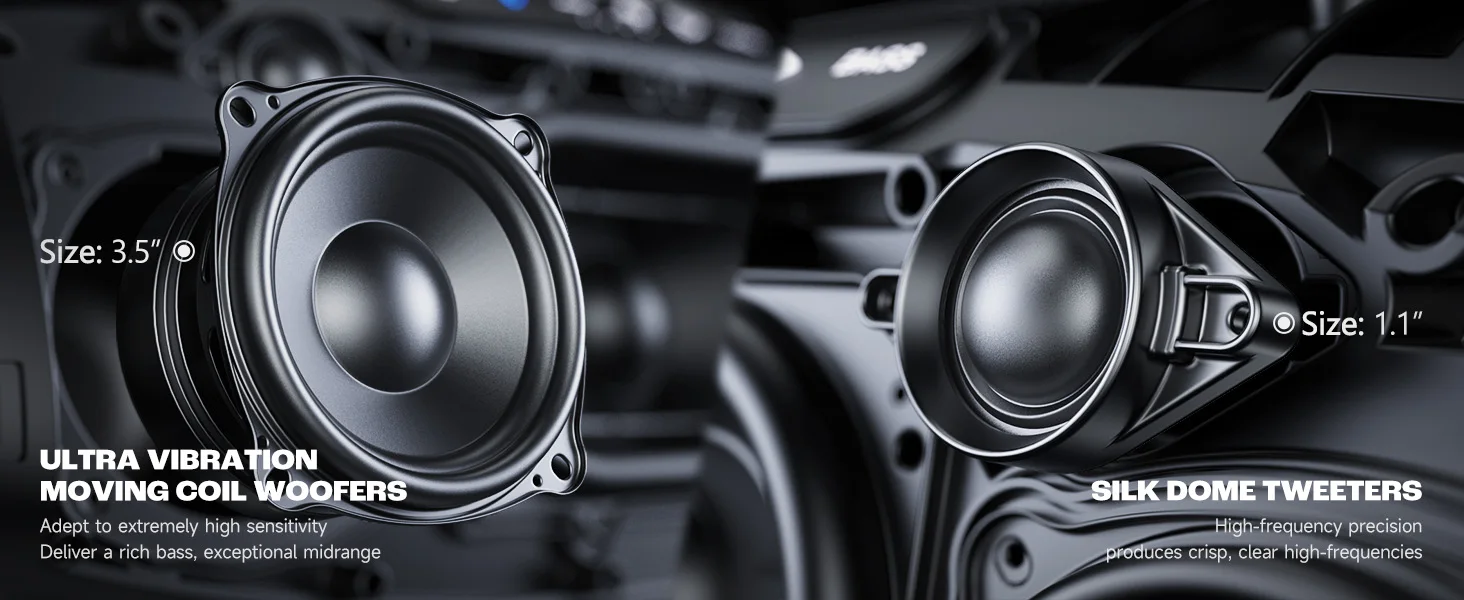 Five Drives, Three-Way Higher Sensitivity Acoustics: One huge large subwoofer (7.5*4.5”) produces monstrous and resonant bass can achieve 40Hz. Two mid-woofers (3.5”) enhance the presence of vocals in the audio mix. Two tweeters (1.1”) reproduce clarity and precision treble. This three-way design helps the portable speaker in achieving a more balanced and accurate sound, particularly beneficial for creating a 3D audio experience, making it feel like the sound is coming from different directions