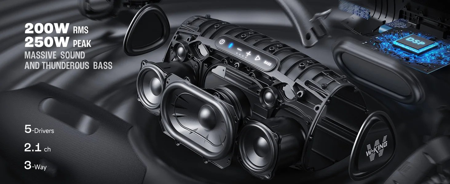 300W Peak 200W RMS Deepest Dynamic Bass: The massive 300W peak allows the bluetooth speaker to deliver extreme dynamic and powerful bass and treble, providing an immersive listening experience. A robust 200W RMS ensuring high-quality massive sound reproduction over extended periods without distortion. Whether for professional music studio, large party, home gathering, movies or games, the bluetooth speaker is desirable to you
