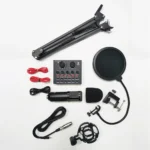 1. All-in-One Podcasting Equipment: This podcast equipment bundle includes a BM-800 condenser microphone, double-layer pop filter, adjustable suspension scissor arm stand, shock mount, wind foam cap, headphones, power cable, and a live sound card. It’s perfect for podcasting, live streaming, content creation, and recording music and short videos.