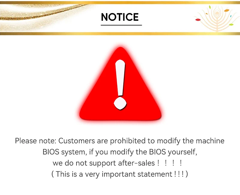Please notice: Customers are prohibited to modify the machine BIOS system, if you modify the BIOS yourself,we do not support after-sales ( This is a very important statement !!!)