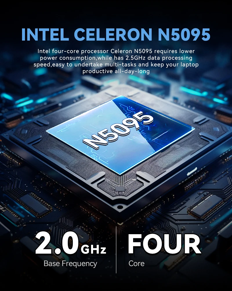 Intel four-core processor Celeron N5095 requires lower power consumption,while has 2.5GHz data processing
