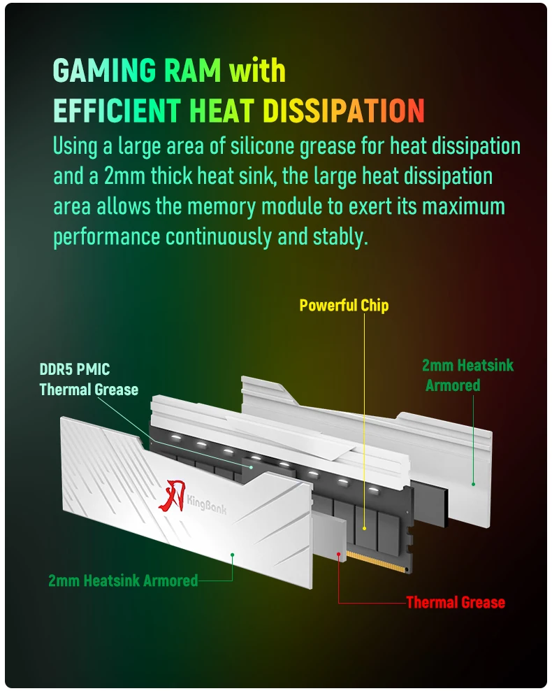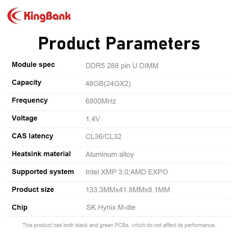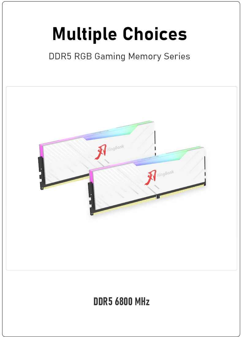 KingBank Black Heatsink DDR5 gaming memory can run up to 6800MT/s. Each 288-pin DIMM is equipped with PMIC (Power Management IC) and ECC (Error Correcting Code), featuring a more stable performance and high-speed operation. Armored with aluminum alloy heatsink, titanium-grey with a Chinese character “Blade”, the memory modules function with better heat dissipation. With selected originally produced IC and other parts, they have undergone rigorous tests on compatibility, reliability and overall performance.
