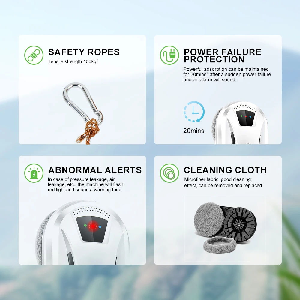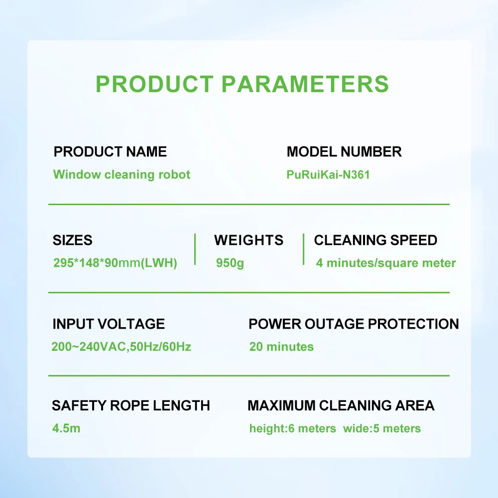 1. Wait 20 seconds after starting up until the blue light stop flashing,Then start working. Because the robot need 20sec to detect the glass plane.