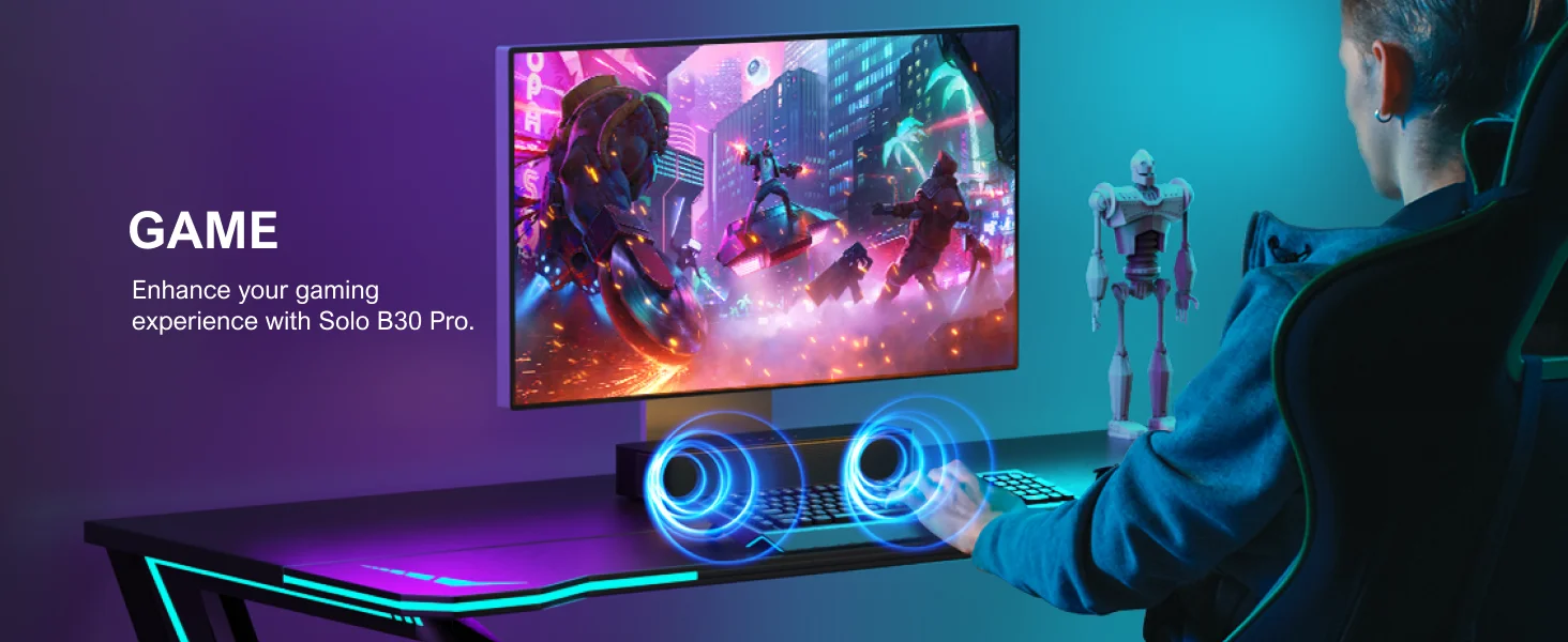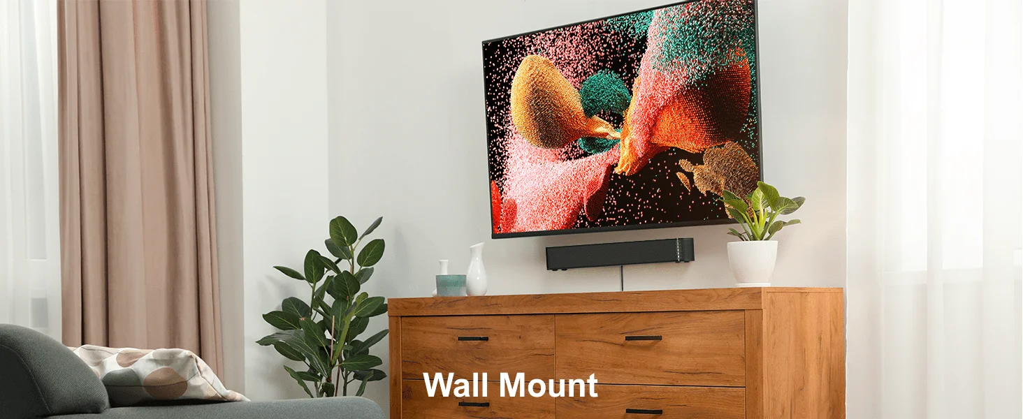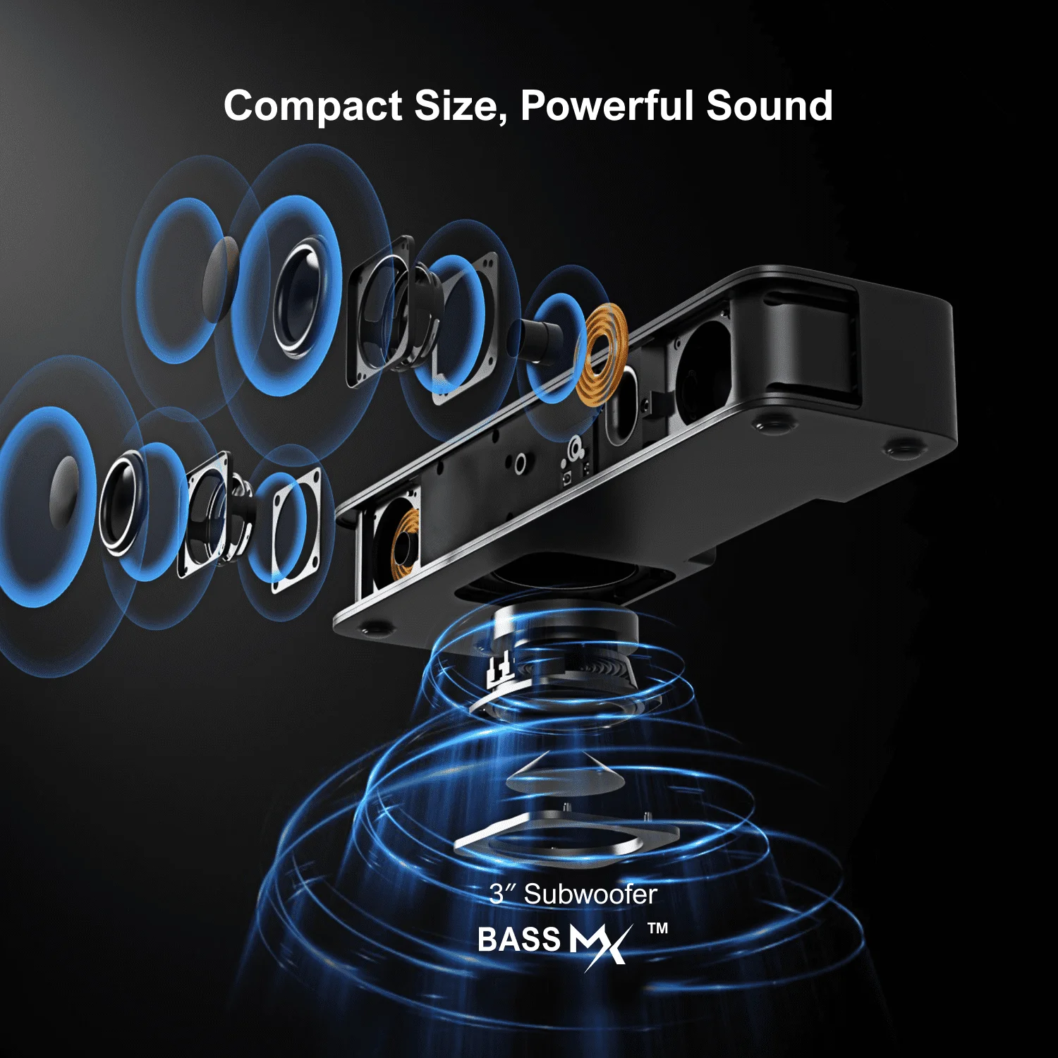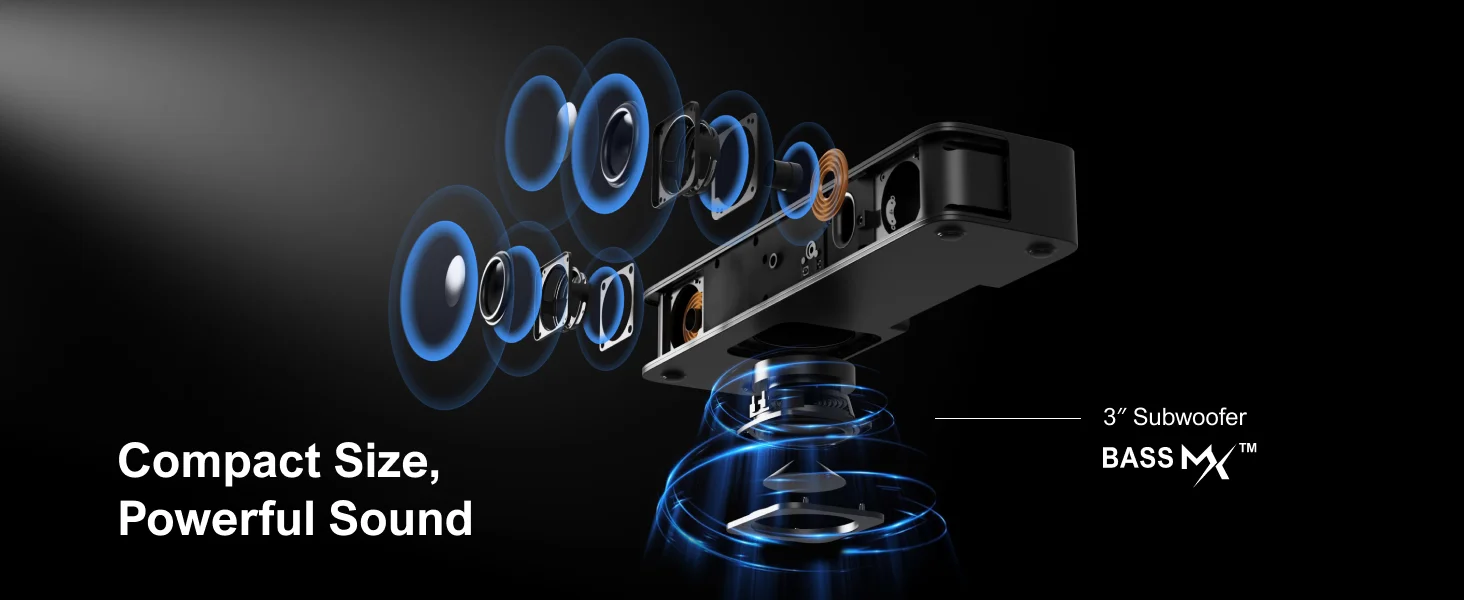 Ultimea exclusive “BassMX” enriches the low frequencies, enabling adjustable bass for the enhanced bass effect. Its compact design allows it to be easily placed on a stand, cabinet, beneath the TV, or mounted on the wall. Additionally, the tv soundbar is portable enough to be moved to spaces like the living room, bedroom, gaming room, or even an RV.