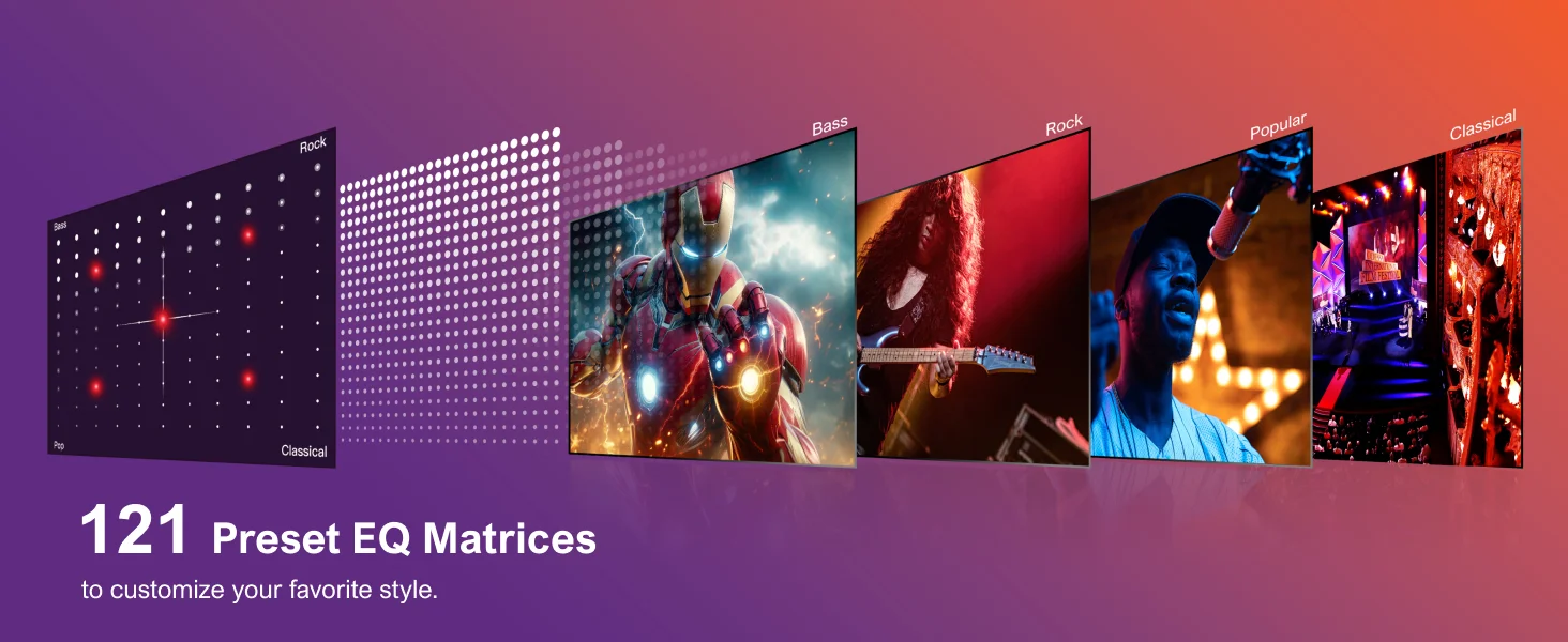 The Ultimea App caters to the ultimate audio enthusiast with 121 preset equalizer matrices, tailored for four distinct sonic preferences: Bass, Pop, Classical, and Rock. Explore precision tuning and fine-tune your listening experience with dynamic adjustments to achieve your desired effects.
